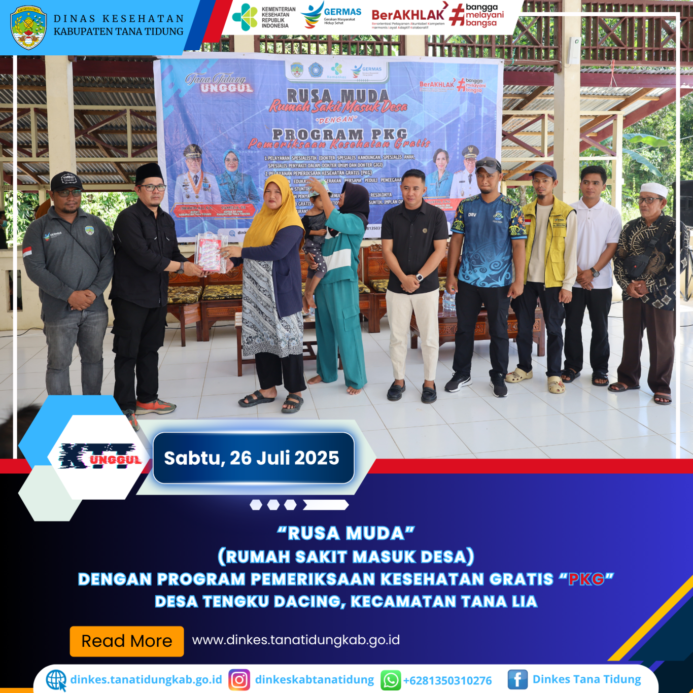 Dalam upaya meningkatkan layanan kesehatan yang merata hingga ke pelosok, Pemerintah Kabupaten Tana Tidung melalui Dinas Kesehatan melaksanakan pelayanan Kesehatan Rumah Sakit Masuk Desa ..