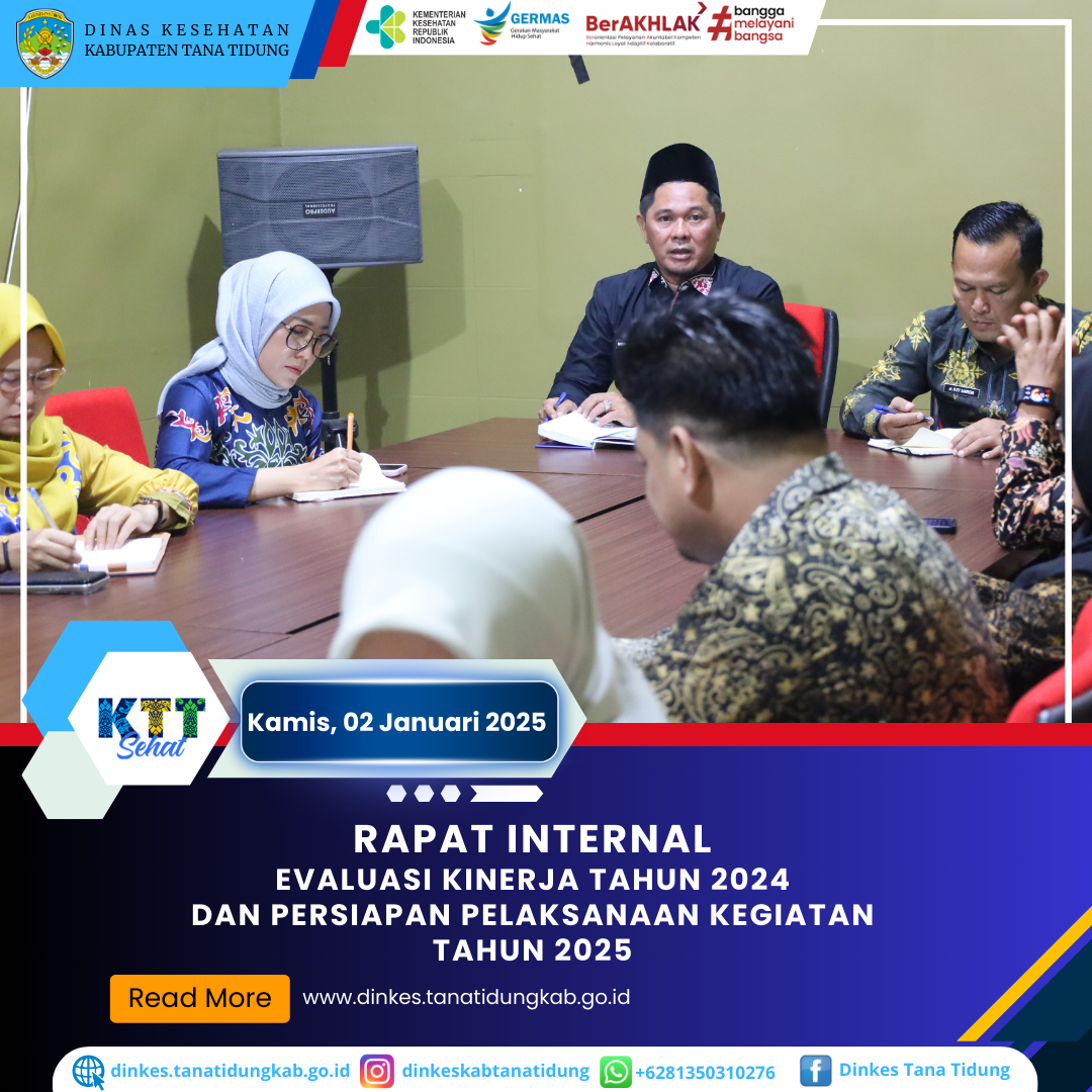 Bertempat di Ruang Rapat Dinas Kesehatan Kabupaten Tana Tidung Kepala Dinas Kesehatan Bapak, H. Mohamad Sarif, S.Pi., M.HP memimpin rapat internal terkait Evaluasi s..