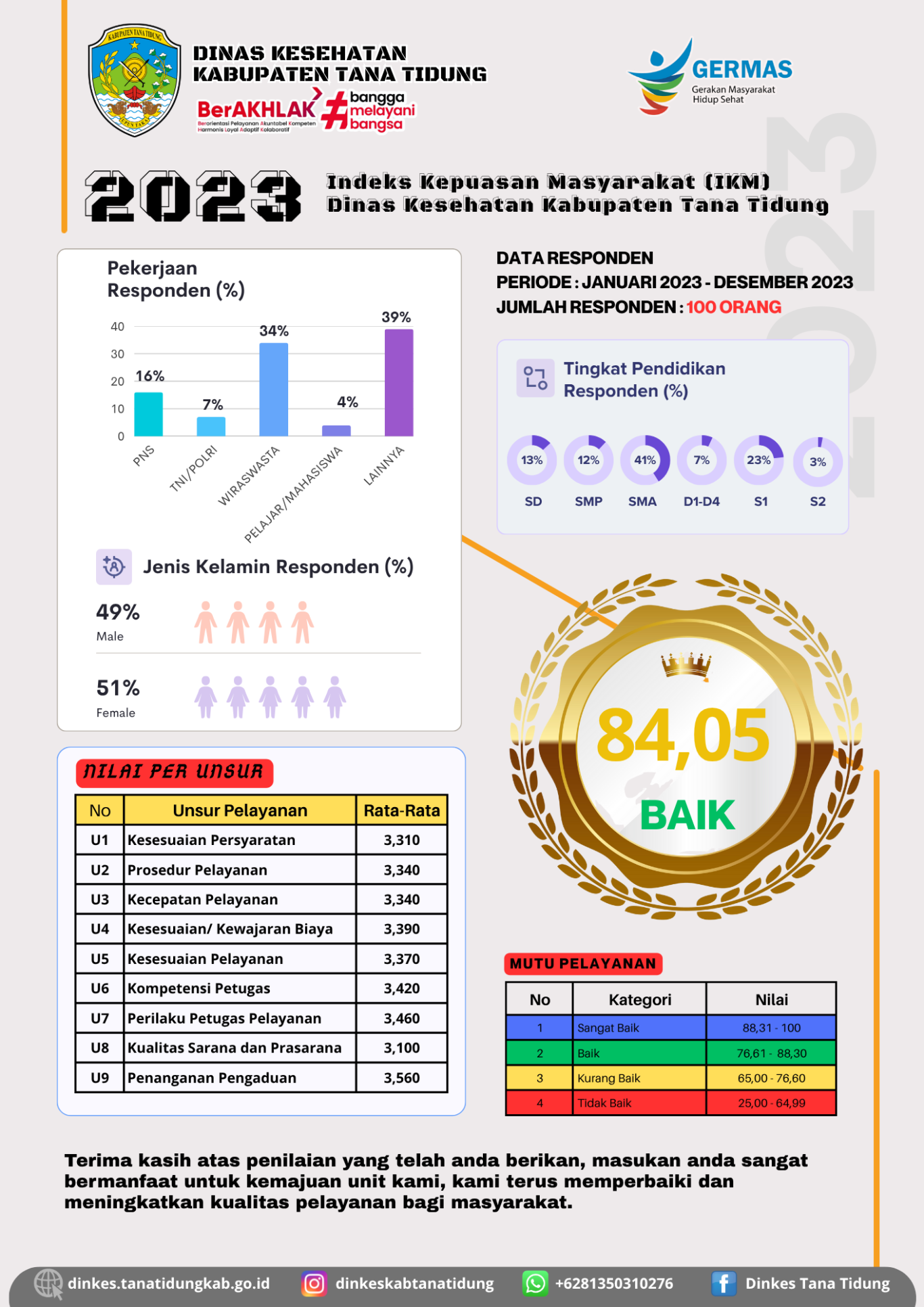Dalam rangka meningkatkan kualitas pelayanan publik, Dinas Kesehatan Kabupaten Tana Tidung telah melaksanakan Survey Kepuasan Masyarakat (SKM) pada Tahun 2023. Kegiatan ini bertujuan untu..