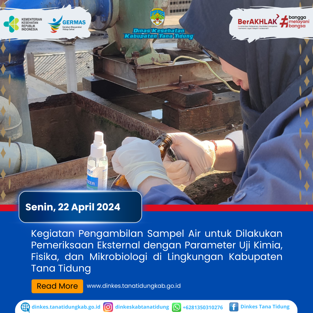 Pengambilan sampel air untuk dilakukan pemeriksaan eksternal dengan parameter uji kimia, fisika dan mikrobiologi. Pemeriksaan dilakukan secara berkala untuk memastikan sumber air yang did..